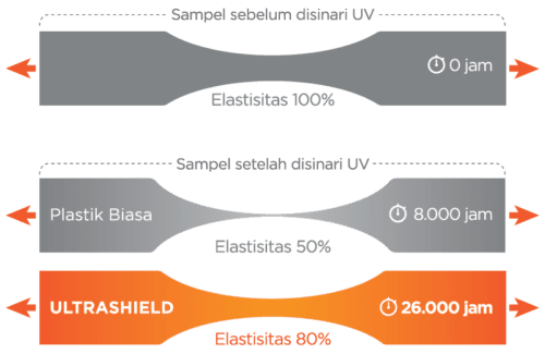 Seiring waktu, produk plastik yang terpapar Sinar UV akan rapuh, getas dan pada akhirnya pecah. Teknologi Ultrashield dikembangkan dengan lebih dari tiga kali perlindungan UV dibanding plastik pada umumnya. Menjamin produk dapat bertahan lebih lama di bawah paparan sinar matahari dan cuaca ekstrem sekalipun.